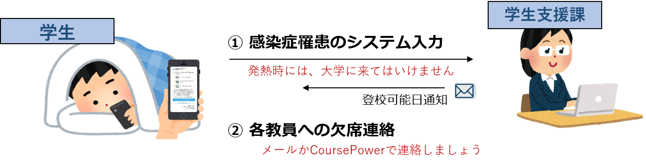 インフルエンザや新型コロナウイルス感染症などの学校感染症と診断された場合は、感染の拡⼤を防⽌するため、講義に出席することはできません。その措置により出席日数で不利が生じないよう、「公欠」を取得するための手続きが定められています。ただし、この公欠が認められるためには、感染の事実を証明する書類(陽性証明書)をシステム登録して頂くことが必要です。 なお、インフルエンザや新型コロナウイルス感染症以外の学校感染症の扱いについては、学校感染症とは?を参照して下さい。〇 届出の流れ